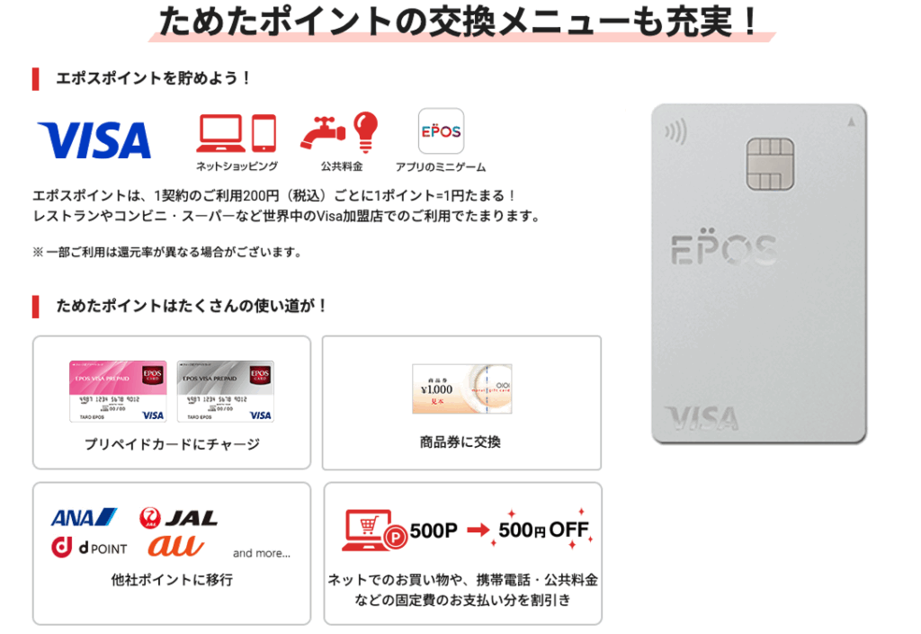 エポスカード![]() | 永年無料 | 0.5% ※条件によってポイントアップあり | VISA | EPOS PAY | Apple Pay、Google Pay | 海外旅行保険自動付帯(最高500万円) | 飲食店での割引や特典など |
