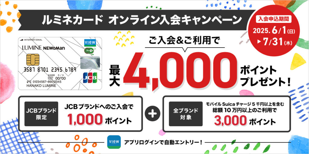 ルミネカード![]() | 初年度無料 2年目以降1,048円(税込) | 1.0% ※購入先によってポイントアップあり | VISA、JCB、MasterCard | Suica | Apple Pay、Google Pay(Google Payはタッチ決済不可) | 国内旅行傷害保険、海外旅行傷害保険 | ルミネ、ニュウマンが5%オフなど |