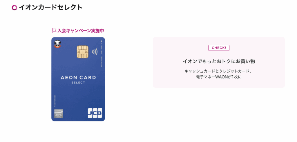 イオンカードセレクト![]() | 永年無料 | 0.5%~1.33% | VISA、JCB、MasterCard | WAON、イオンiD | Apple Pay | ショッピングセーフティ保険(最高2,000万円) | お客さま感謝デーのお買い物5%オフなど |