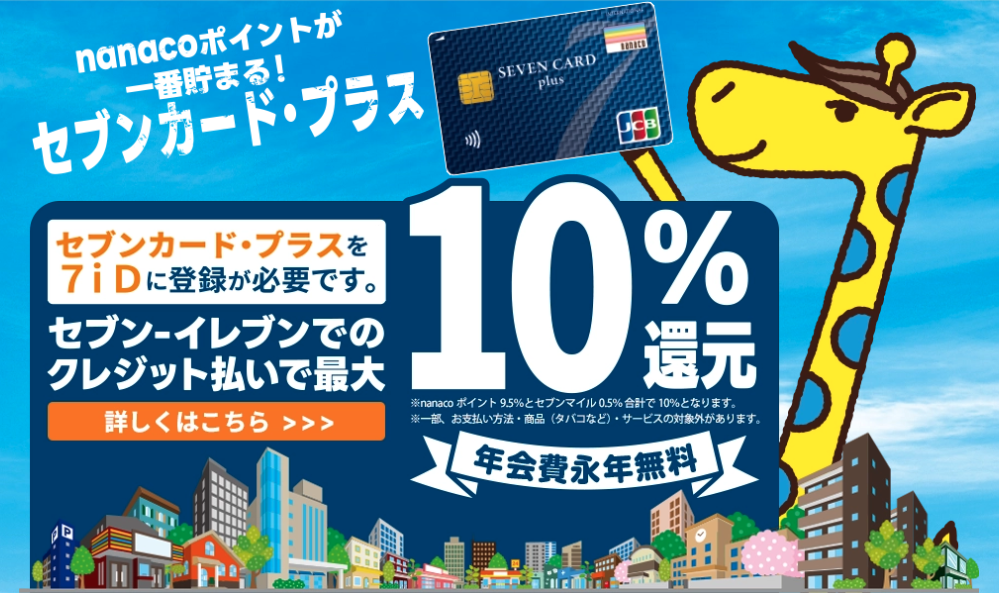 セブンカード・プラス![]() | 永年無料 | 0.5% ※条件によってポイントアップあり | VISA、JCB ※ディズニーデザインはJCBのみ | nanaco | Apple Pay、Google Pay | 海外ショッピングカード保険 | 8のつく日(ハッピーデー)は5%割引 |