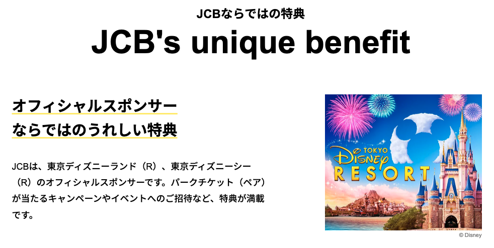 JCBはオフィシャルスポンサーなので、東京ディズニーランドと東京ディズニーシーそれぞれのペアチケットのプレゼント企画や新しいイベント開催に合わせて特別に招待されるなど優待が充実しています。