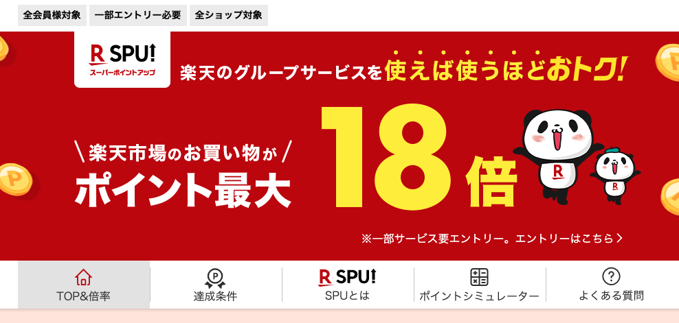 例えば、楽天市場を利用する場合は、「楽天市場でのショッピングの利用」「楽天カードの利用」「カスタマイズ特典」の名目でそれぞれポイントが貯まります。SPU(スーパーポイントアッププログラム)により、条件を満たすことで還元率が3.0%以上に跳ね上がります。
