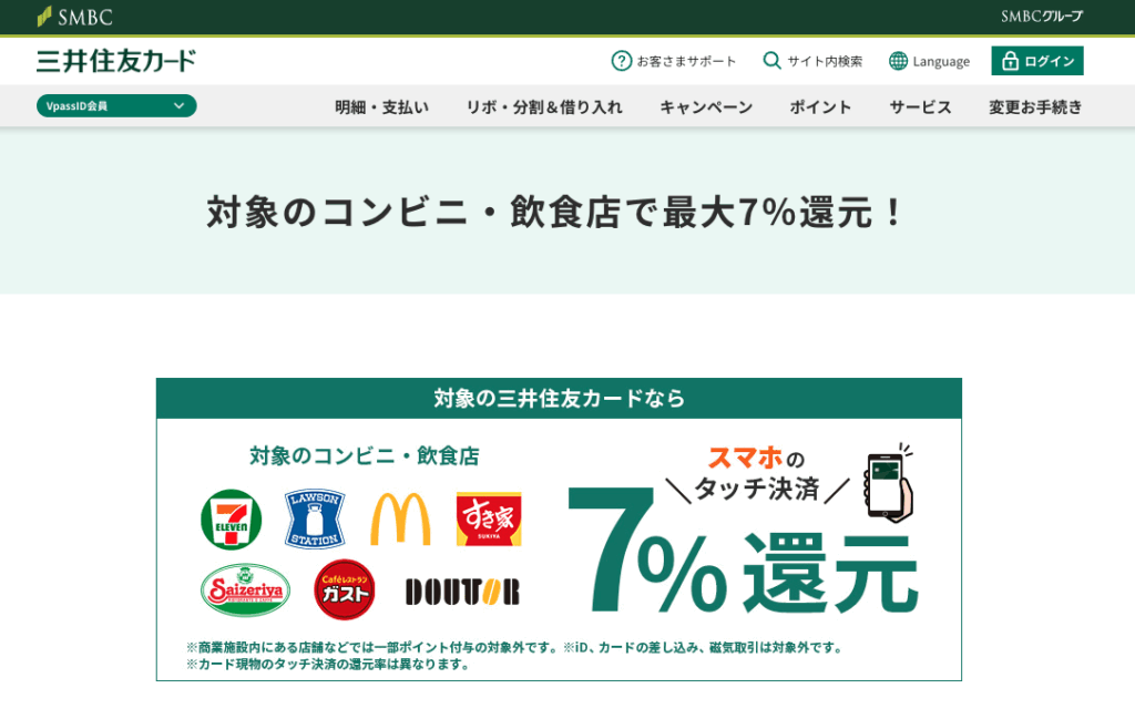 三井住友カード ゴールド(NL)は、対象のコンビニ(セブン-イレブン、ローソン、ファミリーマート等)や飲食店(マクドナルド、サイゼリヤ、バーミヤン等)で、スマホのタッチ決済(Visa/Mastercard)を利用すると、最大7%のVポイント還元を受けられます。