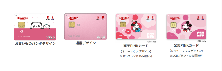 | 最短5分(楽天カードアプリからの申し込み、デジタルカードの場合) | Visa / Mastercard / JCB / American Express | 4種類(ミッキーマウス、ミニーマウス、お買い物パンダ、通常デザイン) |